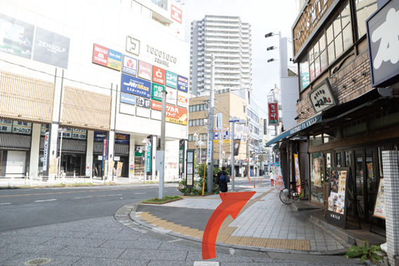 2、エスカレーターを降りて所沢駅西口を出ると、右手に「PROPE」と書いてあるゲートのある「所沢プロペ通り」がありますので、ゲートをくぐって通りを進んでください。