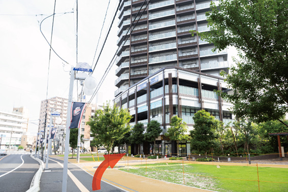 3、そうすると車道に突き当たるので、信号は渡らず、道なりに斜め右方向に進んでください。